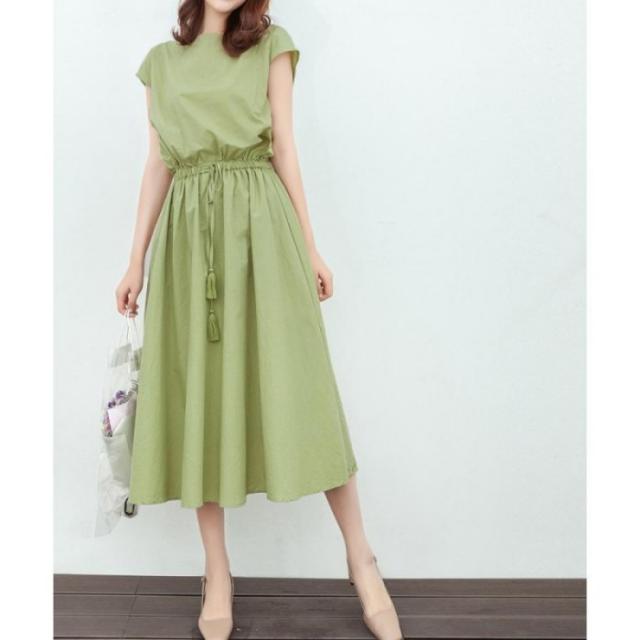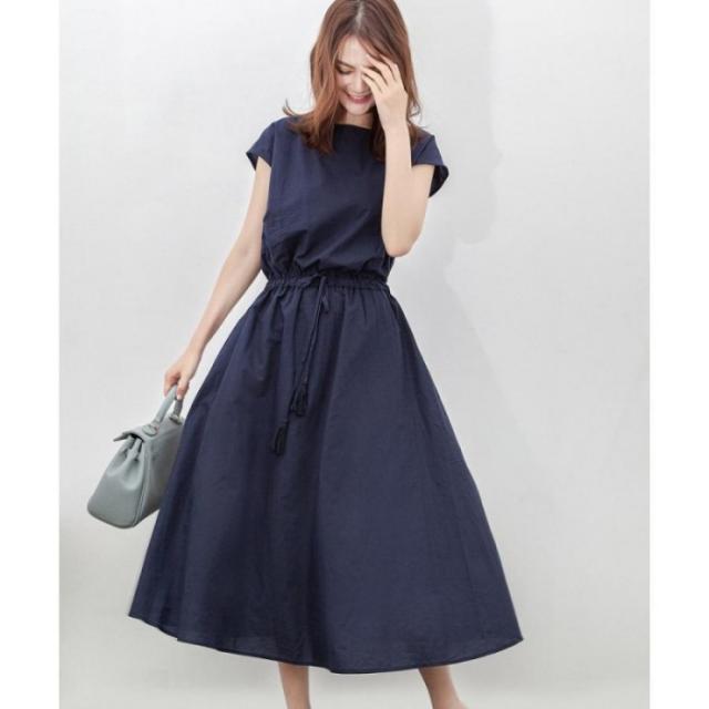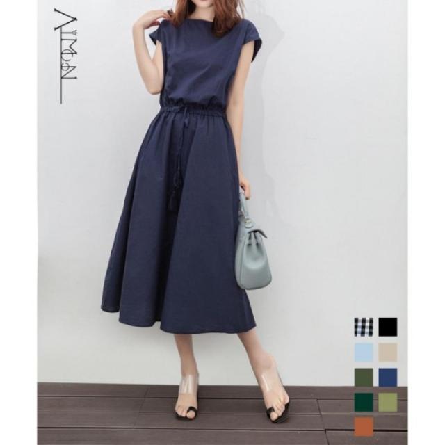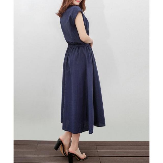 ウエストマーク ワンピース ゆったり ロングワンピース 春夏 ナチュラルワンピース 半袖 韓国 スッキリと着こなせて着やせするフレンチスリーブタイプの綿麻ワンピース