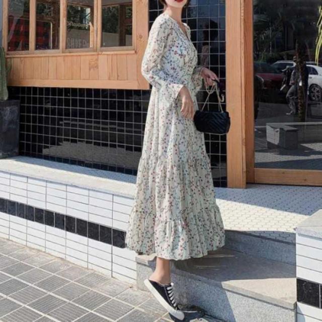 レディース 春秋夏 花柄カシュクールワンピ 韓国風Vネック オルチャン フレアワンピース Aライン ハイウエストきれいめ