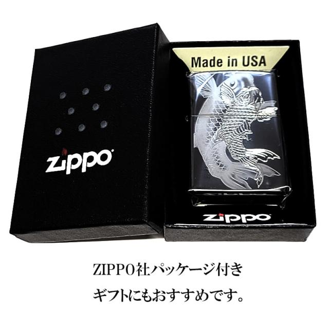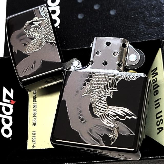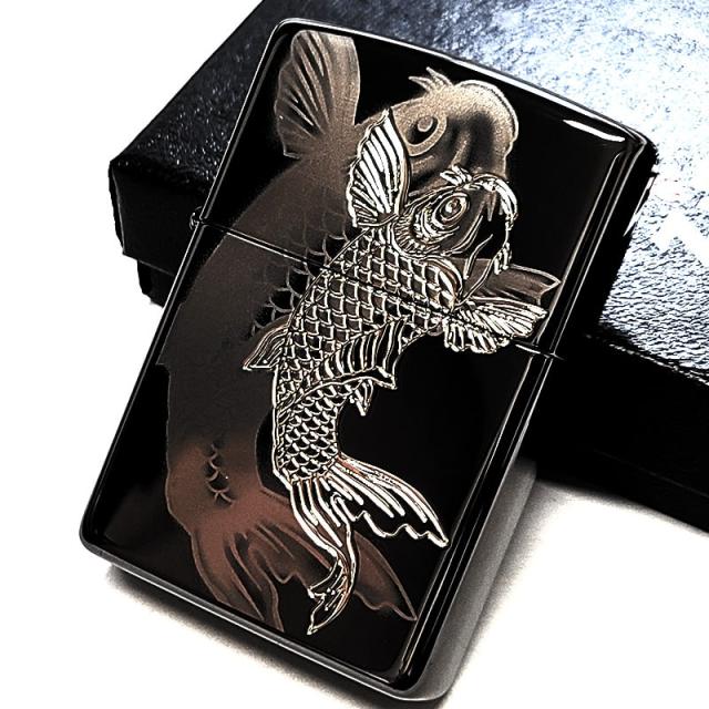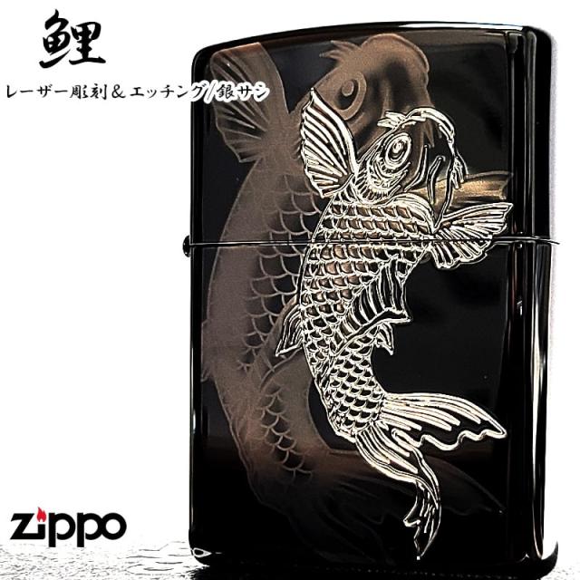 ZIPPO ライター 和柄 細密レーザー彫刻&銀差し 鯉 ジッポ ブラックニッケル&シルバー かっこいい お守り 黒銀 渋い おしゃれ