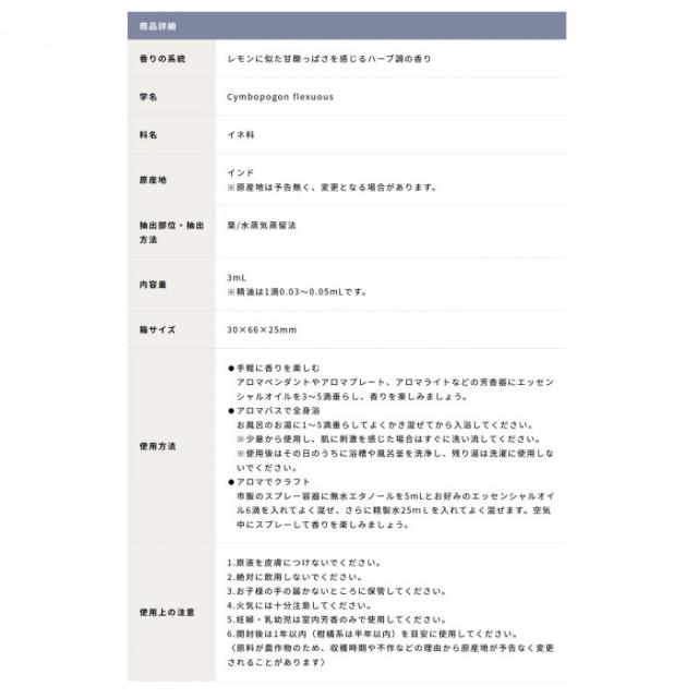 商品詳細:レモンに似た甘酸っぱさを感じるハーブ調の香りのエッセンシャルオイルです。芳香器で香りを楽しんだりアロマバスで香りを楽しんだりと、いろんな使い方が出来ます。 生産国:日本