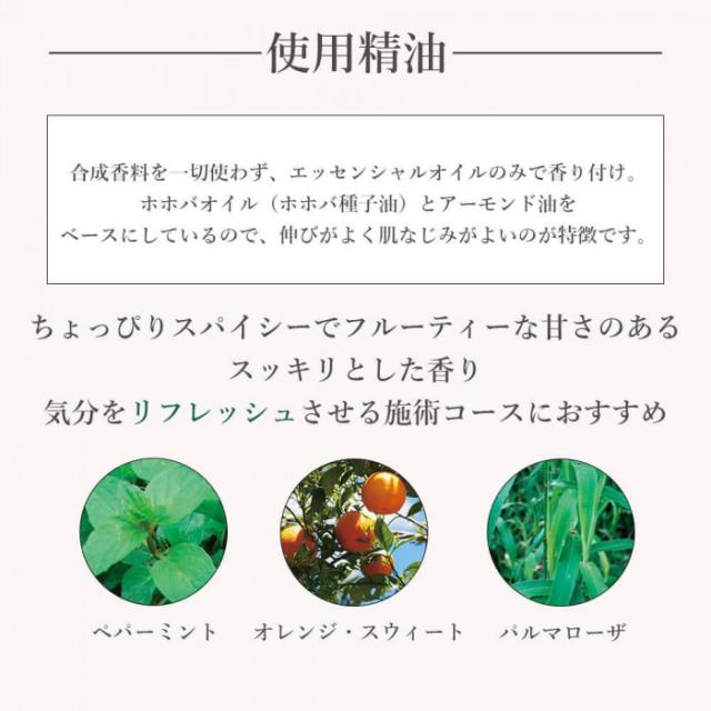 | 成分 | ホホバ種子油、アーモンド油、コムギ胚芽油、セイヨウハッカ油、オレンジ果皮油、パルマローザ油、トコフェロール |