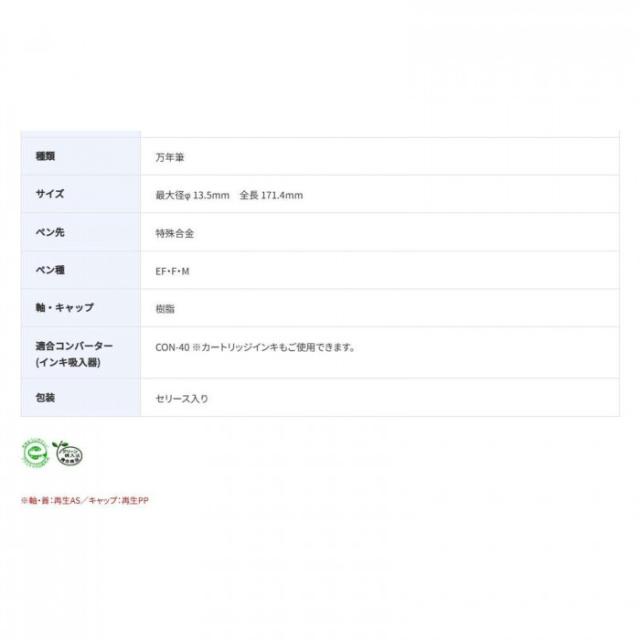 商品詳細:収納に便利、ペン習字に最適なデスクペンです。リサイクル材を使用し、地球にやさしい商品です。 生産国:日本 仕様:ペン先:細字