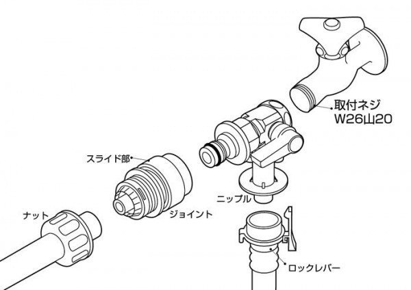 | 洗濯機と散水など、2方向に切替えて使用可能!ジョイント式でホースがワンタッチで着脱できます。 ※散水ホースは内径12〜15mm、外形18〜20mmのホースが取り付けできます。 ※JIS規格品、同等品の自在水栓や万能ホーム水栓などに取り付けできます。 普及品には合いません。 ※2方向同時送水はできません。 ※使用後は水栓本体で止水してください。 |