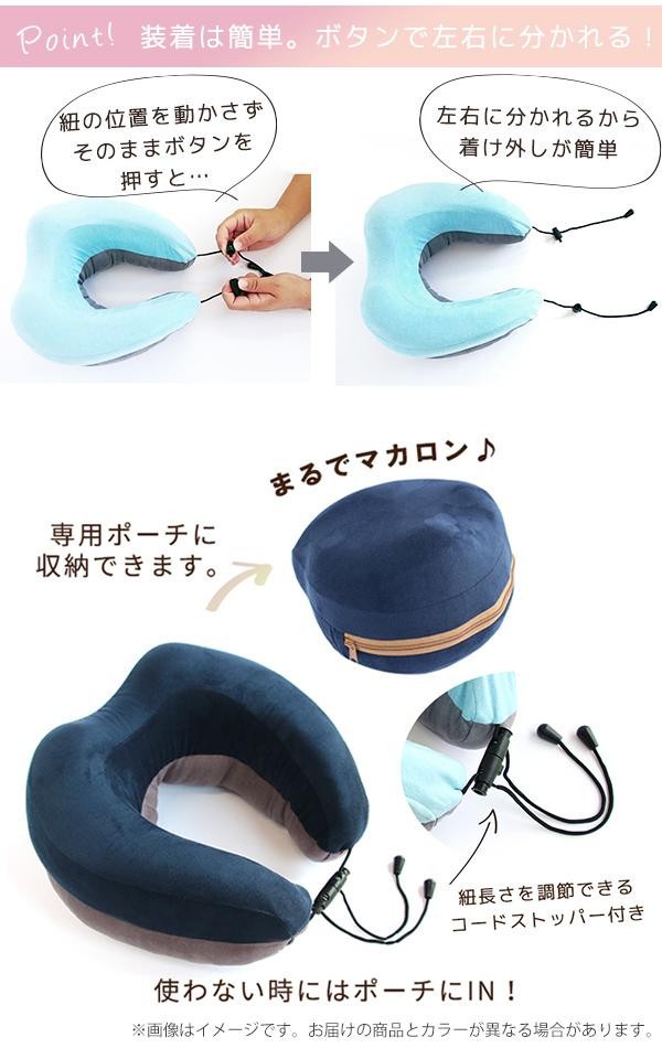 | 付属のポーチに収納すればマカロン風♪首に添った立体構造と、もちふわ感触でリラックス効果大!!紐の長さを調節できる、便利なコードストッパー付き。 |