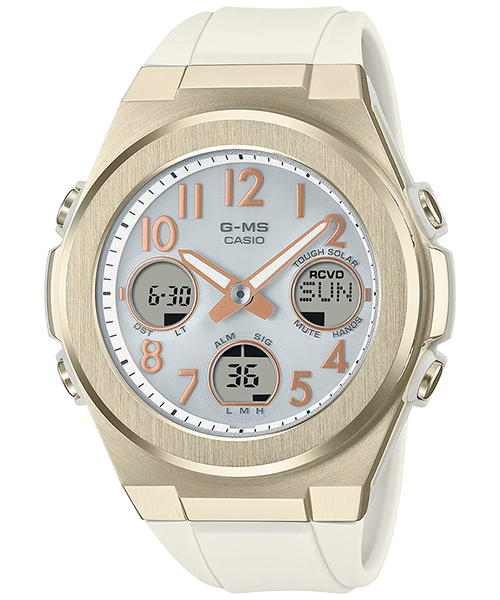 ベースモデルは電波ソーラーモデルのMSG-W610を採用。時分針とデジタル窓を組み合わせたアナログ・デジタルコンビネーションモデルで、見やすいワイドフェイスデザインです。新たに加わったカラーは、ライトイエローゴールドベゼル×クリーム色のバンドカラーと、シルバーベゼル×ミュートピンクのバンドカラーの2色です。通年飽きのこないベーシックなカラーラインアップがさらに充実しました。
