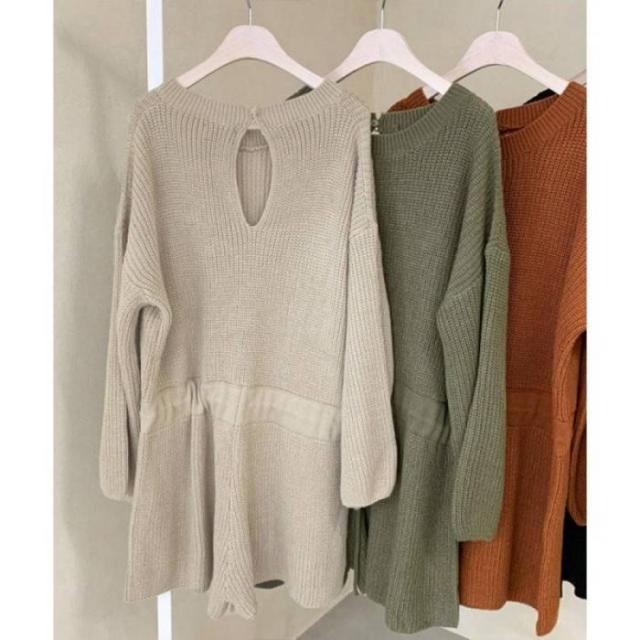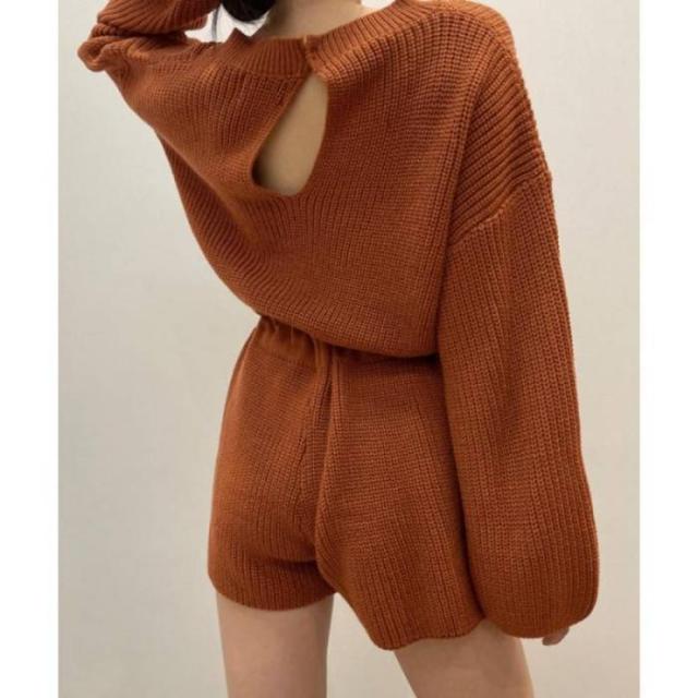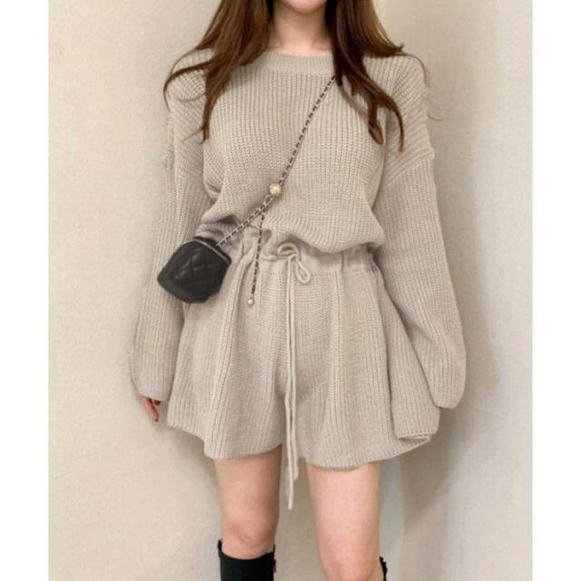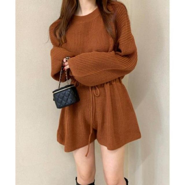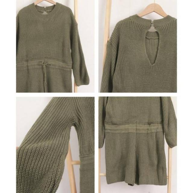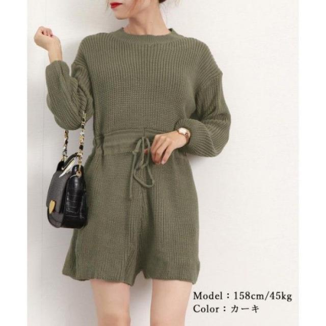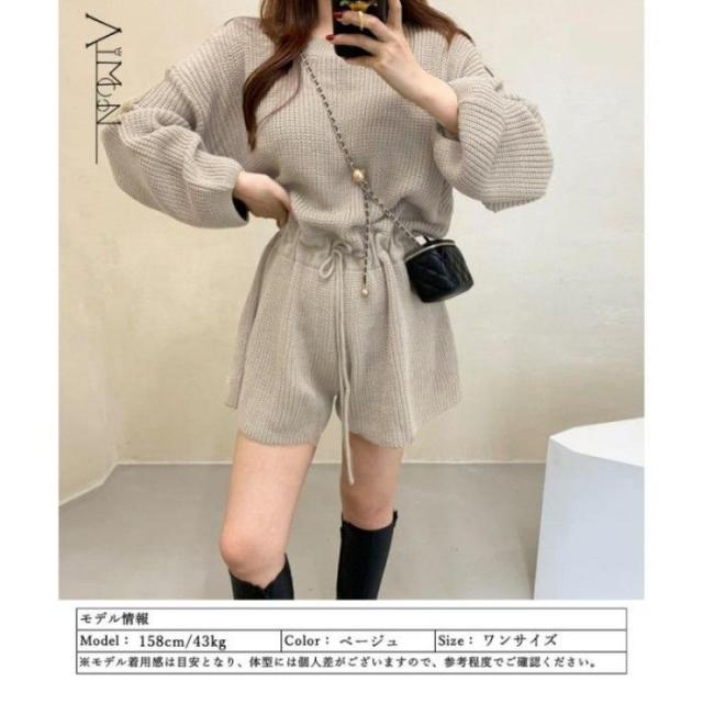 韓国風 ショート丈 ニットロンパース 大人可愛い ボリュームスリーブ コンビネゾン ミニ丈 ざっくりニット ハイウエスト