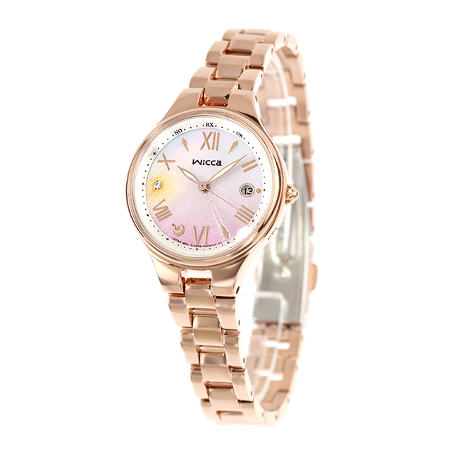 正規品 7年保証キャンペーン 送料無料 シチズン ウィッカ 夏限定モデル 数量限定 電波ソーラー レディース 腕時計 KS1-864-93 CITIZEN wicca アナログ シェル ピンクゴールド ◆初夏の夕空をテーマにした限定モデルです。白蝶貝の文字板にピンクのグラデーションをあしらい、季節感あふれる美しい景色を表現しました。9時位置に太陽をイメージしたクリスタルガラスをセッティング。その周りにあしらったオレンジのグラデーションがベースのピンクと重なり、夕暮れの陽の光を表現しています。7時位置にうっすらと現れる月と星をデザイン。5時から11時の位置に向かって、飛行機雲をイメージした白いパターンが描かれています。誕生日や記念日のプレゼントにもおすすめです。 発売日:2025年5月発売