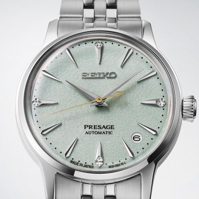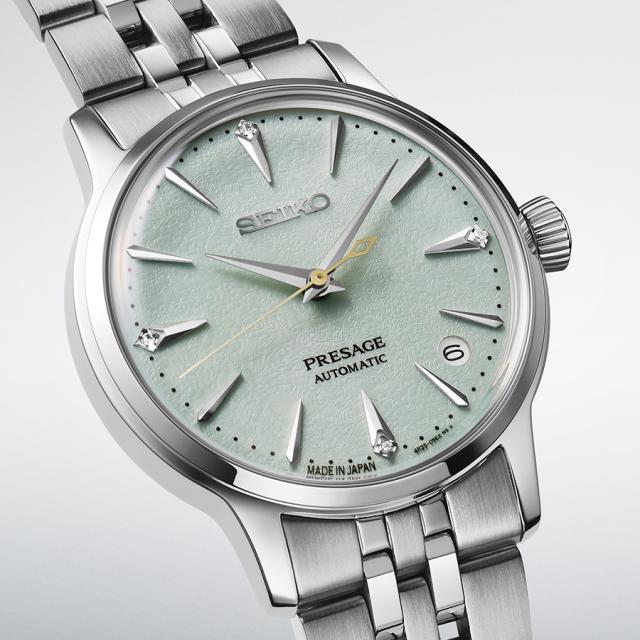 セイコー プレザージュ「カクテルタイム」シリーズより、カクテル“フローズンモヒート”をモチーフにしたレディースモデルが登場。34mmのコンパクトなケースサイズで、女性の手元にも上品に馴染みます。