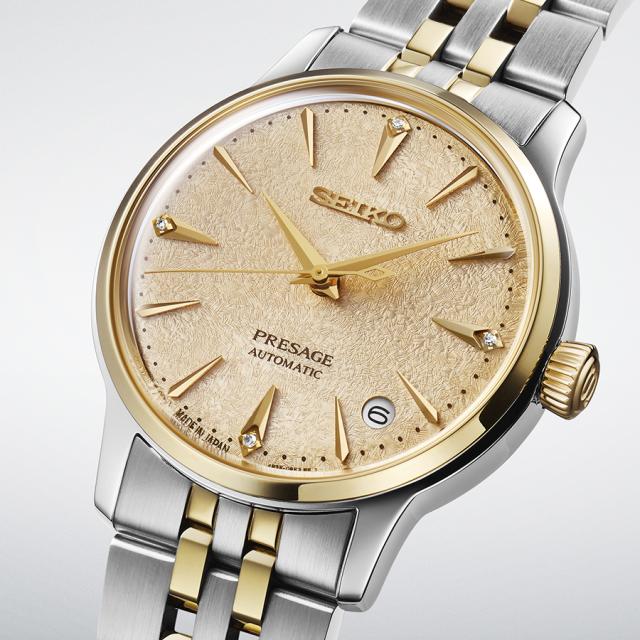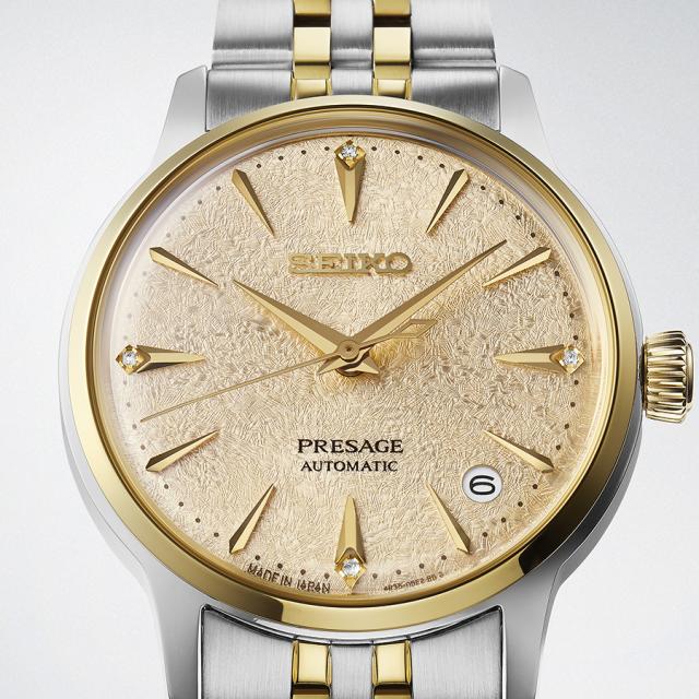 セイコー プレザージュ「カクテルタイム」シリーズより、カクテル“フローズンバナナダイキリ”をモチーフにしたレディースモデルが登場。34mmのコンパクトなケースサイズで、女性の手元にも上品に馴染みます。