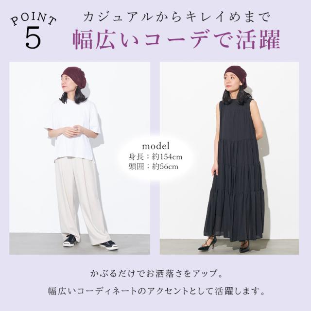 後頭部にゴムが入っているのでゆったりとかぶれ、かぶり方次第でベレー帽風にもかぶれます。