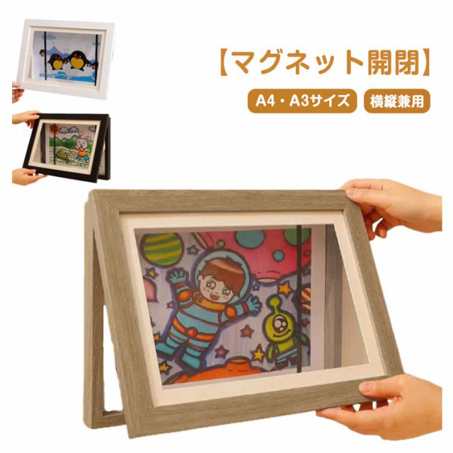 | 【A4・A3サイズ】 【マグネット開閉】【横縦兼用】 子供の絵を美しく飾るためのアートフレームです。 保管用途に最適!似顔絵も保存可能! 多機能額縁!画用紙・フォトフレームにもなる。 | |