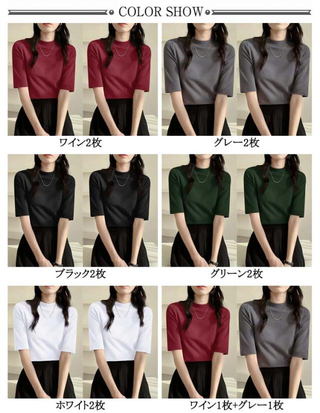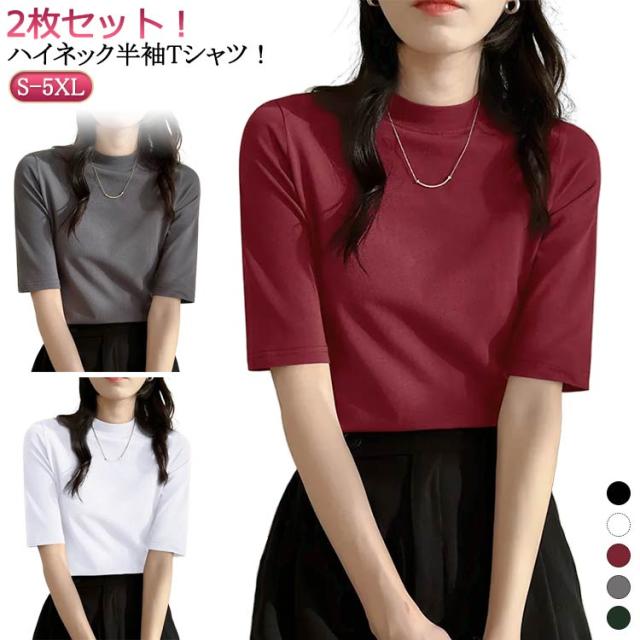 tシャツ カットソー レディース モックネック ストレッチ トップス 半袖 半袖Tシャツ タートルネック カジュアル ハイネック スリム おしゃれ 大きいサイズ 5分袖 Tシャツ プルオーバー 夏服 無地 オフィス シンプル 春 夏 半袖tシャツ 送料無料