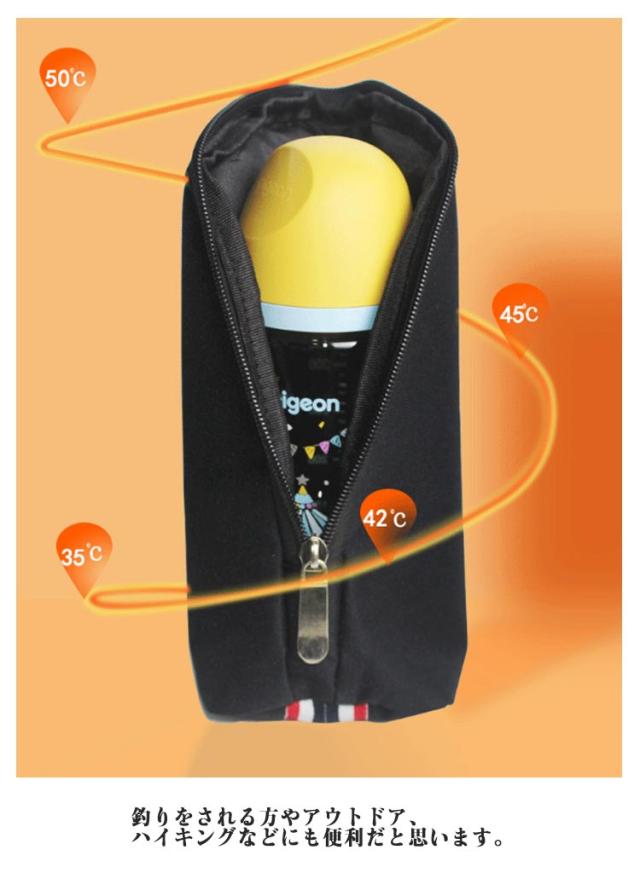 | USBで使える持ち運べるボトルウォーマー。ドリンクを暖かいままキープしたい時におすすめ保温グッズです。 いろいろな場所でドリンクを保温出来ます。 軽量&コンパクトで持ち運びもラクラクです。 ストラップも付いているのでベビーカーフック等色んな所にもかける事ができます。 本体表面が水分や汚れに強い撥水素材になっているのでよごれは水拭きでさっと落とせます。 USBでどこでも給電出来ます。ウオーマーに付属のUSBケーブルをアダプタ、、カーチャージャー、パソコン等に繋ぐ事でどこでも給電できるのでご自宅での授乳だけでなく、外出先、車の中、会社・オフィスでのホット飲料の保温等にもおススメです。(電源アダプタは付属しておりません。) 釣りをされる方やアウトドア、ハイキングなどにも便利だと思います。 使い方:1.電源に接続します。接続するとイルミネーションが0.5秒点灯します。2.イルミネーションボタンを長押しするとマックスモード(赤色点灯) します。イルミネーションボタンを押しながらお好みの温度でご使用下さい。3.2秒長押しすると電源オフとなります。(イルミネーションの点灯が消えます) | |
