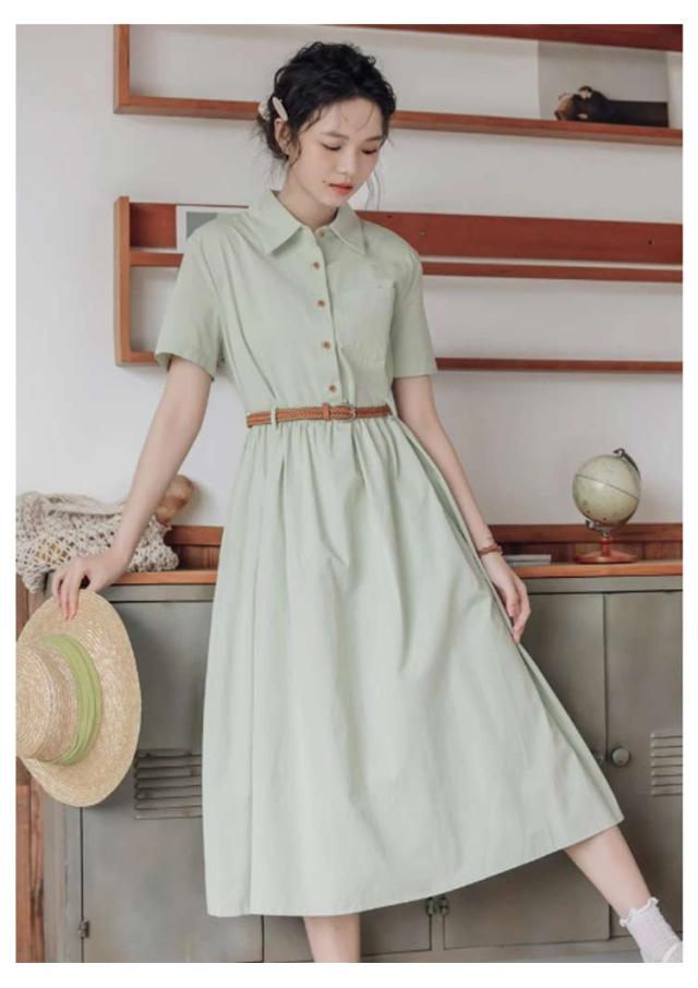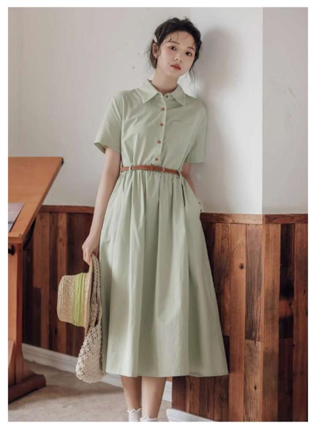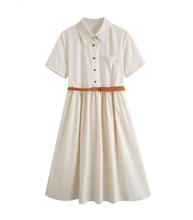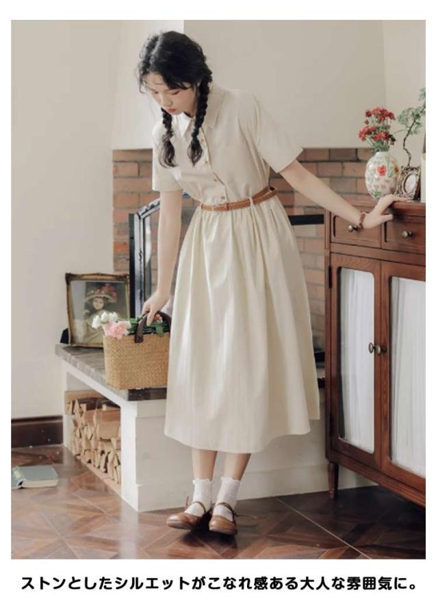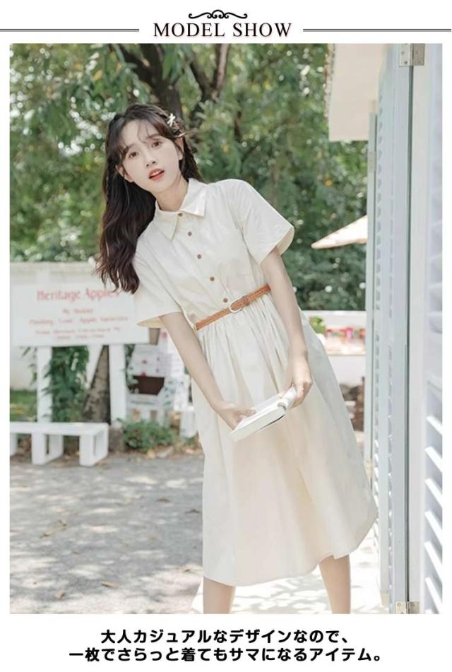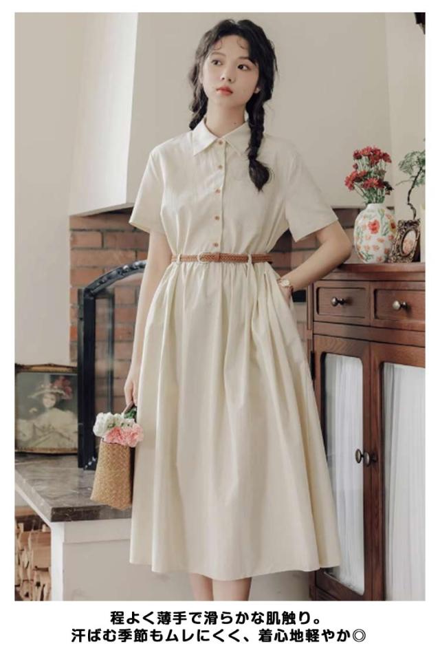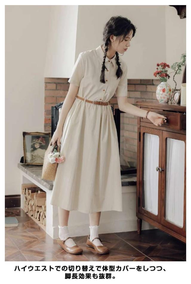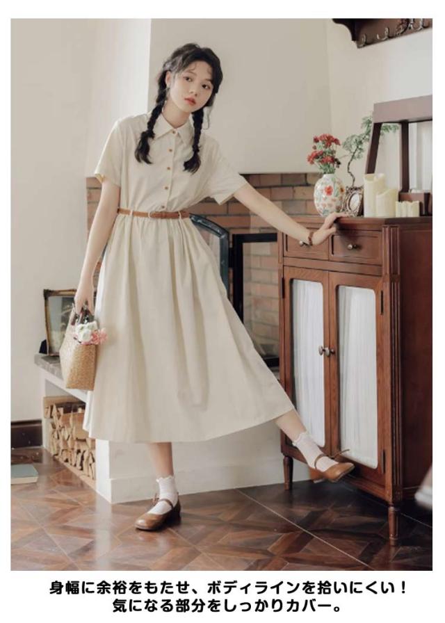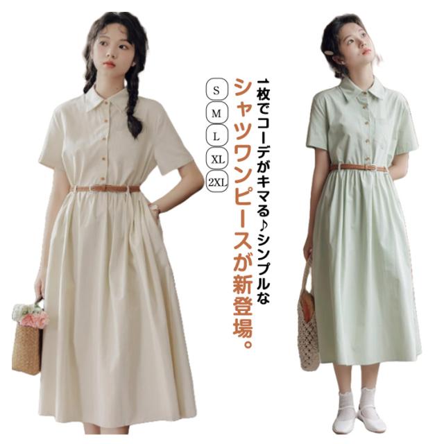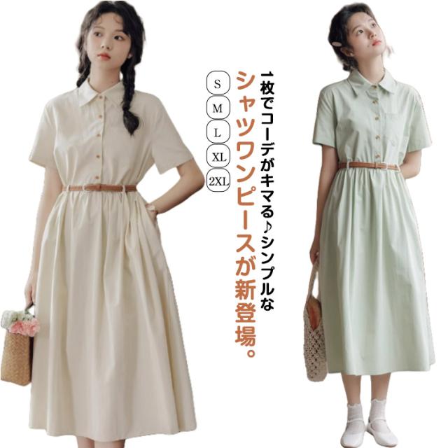 ミモレ丈 レディース 半袖 ワンピース 夏 フレア 無地 送料無料 ロングワンピース シャツワンピース Aライン ロング丈 ベルト付き 大人可愛い ナチュラル ゆったり 体型カバー 着痩せ カジュアル シンプル