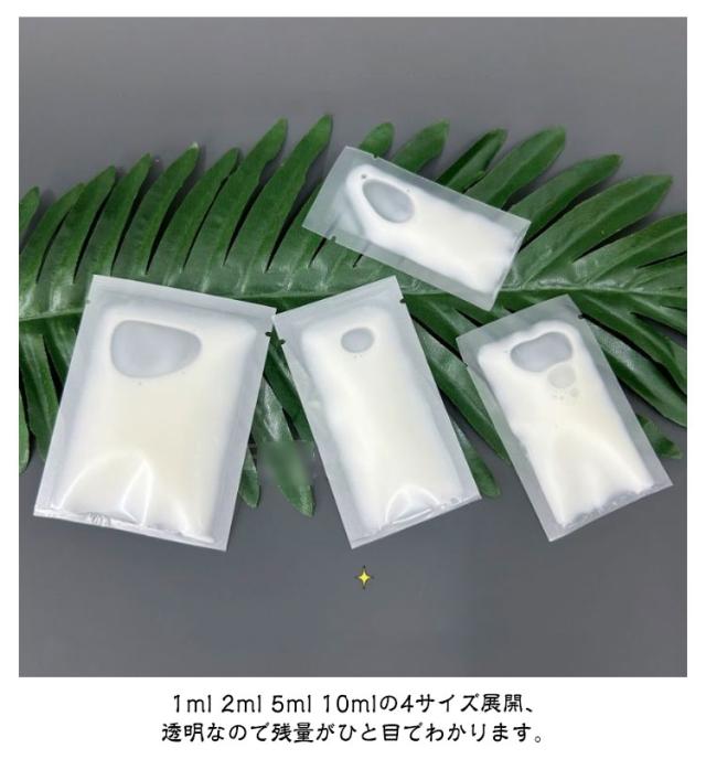 | 旅行やキャンプ、バーベキューの携帯用として使いやすいのパウチ200枚セット。 1ml 2ml 5ml 10mlの4サイズ展開、透明なので残量がひと目でわかります。 大きな注ぎ口で直接液体を注入でき、詰め替え・洗浄がしやすくなっています。 気密性の良いスクリューシールで、ヘアアイロンなどで密封されていて持ち運びも安心。 旅行用シャンプー、ボディーソープ、乳液、化粧水、その他の化粧品などを持ち歩くのに便利です。 | |