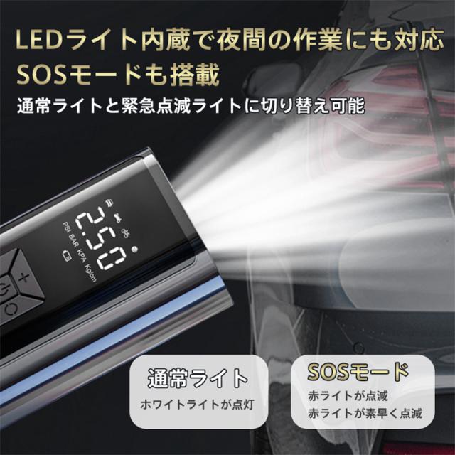 空気入れ 電動 電動エアポンプ USB充電式 タイヤ圧力検知 ロードバイク タイヤ 空気圧指定可 電動ポンプ 携帯 LEDライト 照明付き デジタル表示 アダプター 軽量 事故防止 サッカー タイヤ空気入れ コンパクト 低騒音 オートバイ Type-C充電 操作簡単 LCD表示 トラック SOS 収納袋