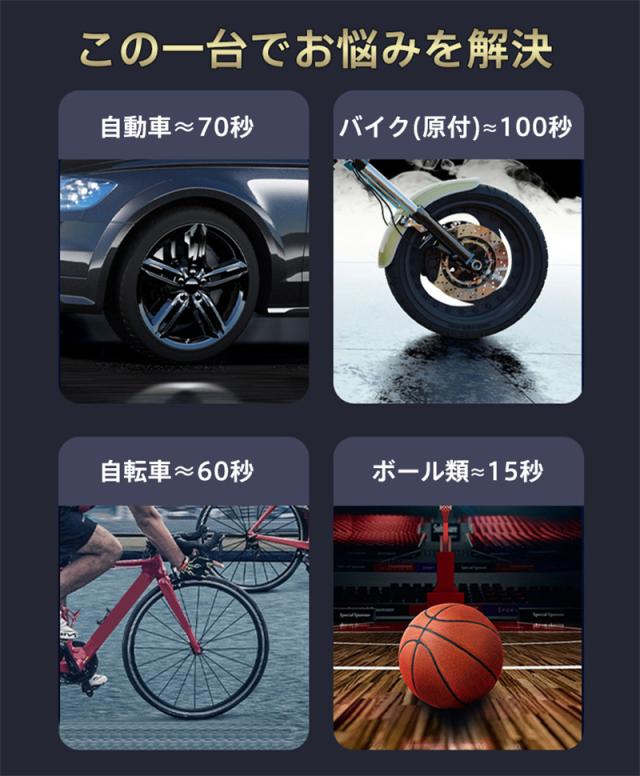 車、バイク、自転車、ボール4つのインフレモード、数値の設定をしなくても、自動的に最適な設定で空気を入れる