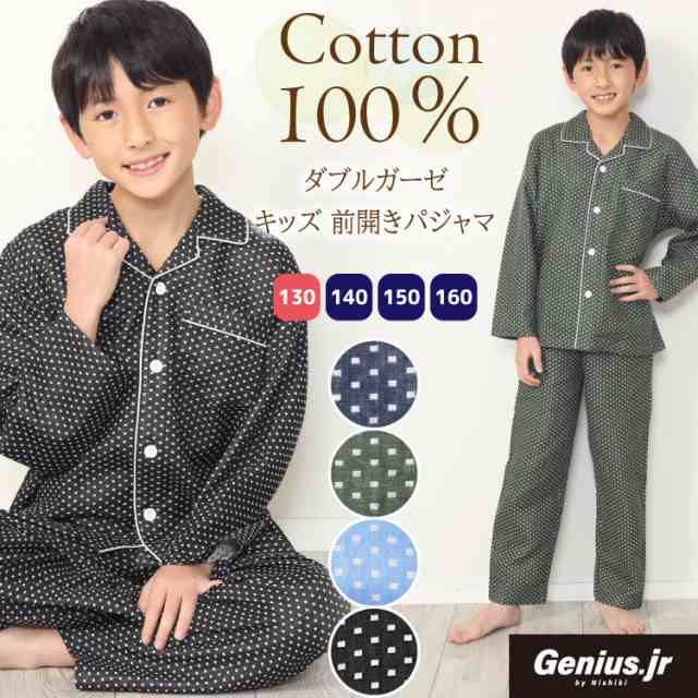 パジャマ キッズ 130 140 150 160 サイズ 男の子 長袖 綿100% 前開き 春 ダブルガーゼ素材 ルームウェア 子供 男児 かっこいい 小学生 中学生 修学旅行 ジュニア ダブル ガーゼ テーラー襟 ドット柄 ジュニアサイズ