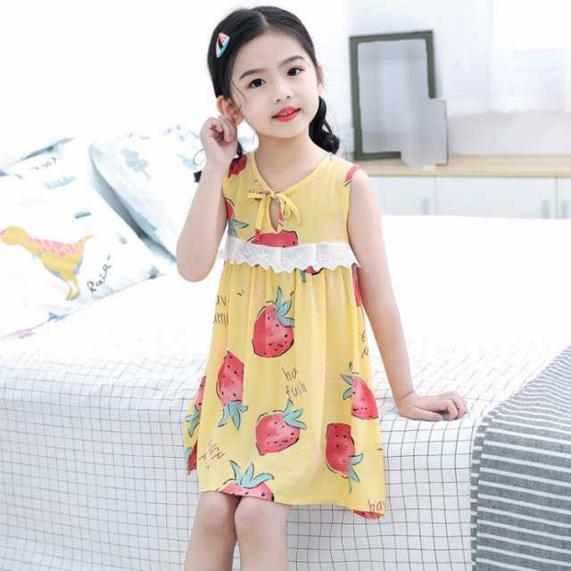 パジャマ キッズ ネグリジェ 女の子 ノースリーブ 夏 ルームワンピース 子供パジャマ かわいい ナイトウェア ナイトドレス 綿100 アヒル/いちご柄 部屋着 ふわふわ 肌に優しい 通気性 おしゃれ 涼しい