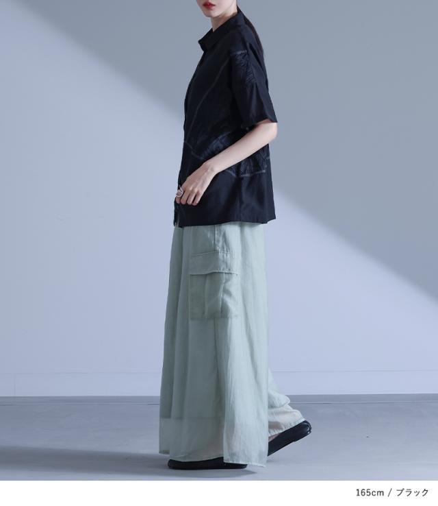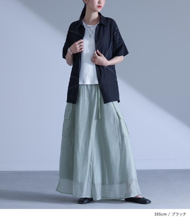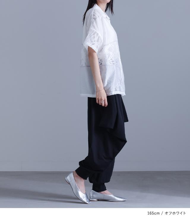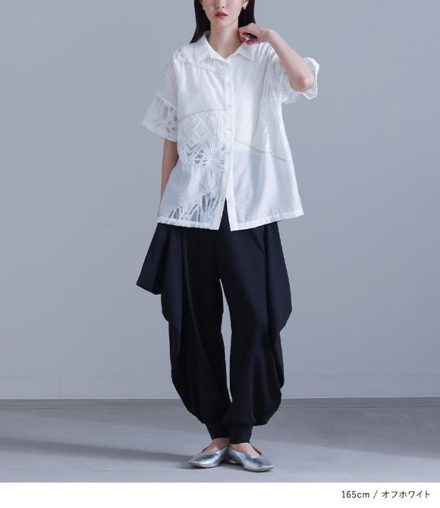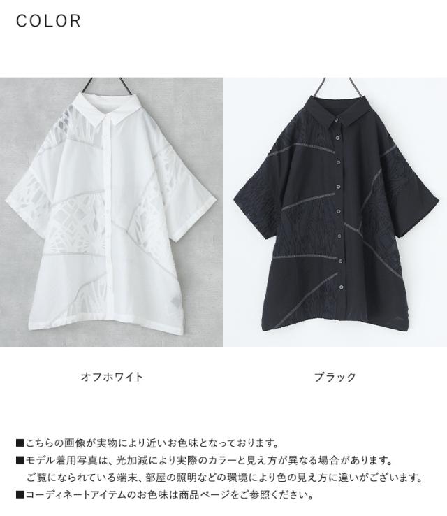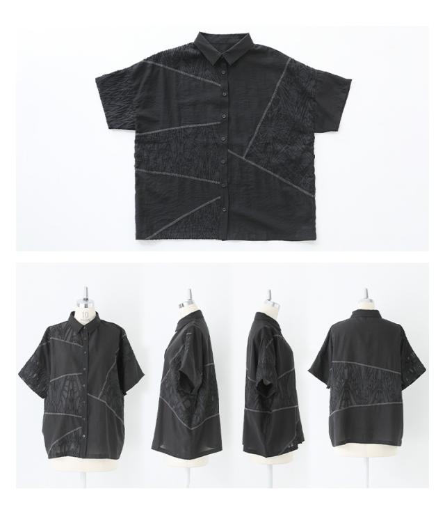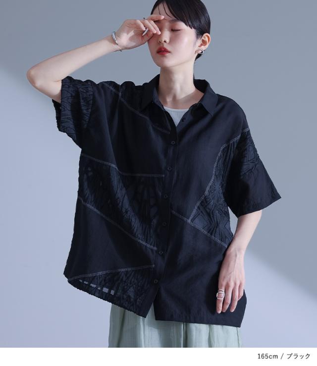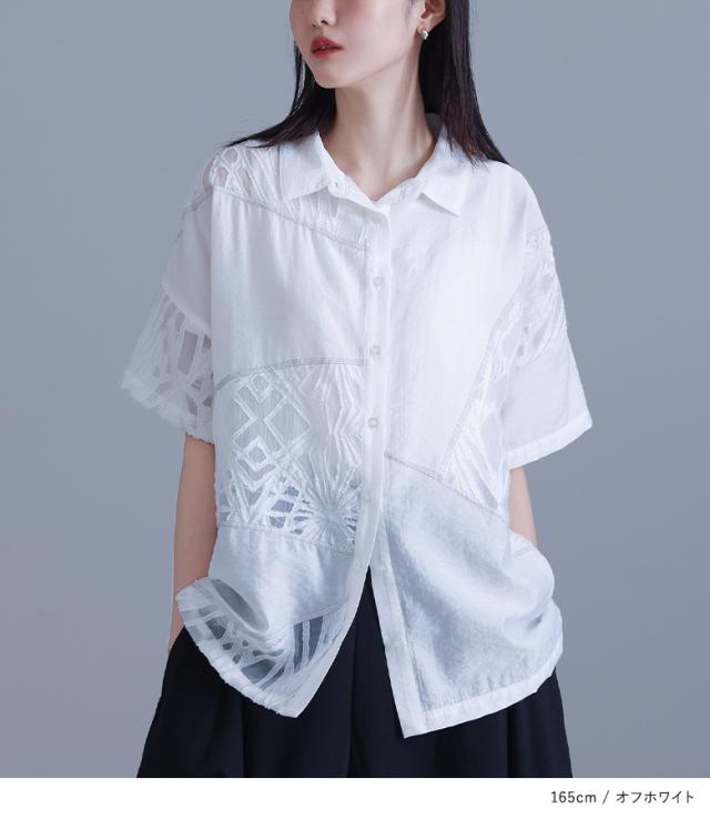 『シアー切替シャツ』※メール便可※【10】[シャツ レディース トップス ブラウス 半袖 シアー 無地シアー 柄シアー 切替 襟付き 前開き 薄手 配色 ステッチ 透け感 モード きれいめ 夏]