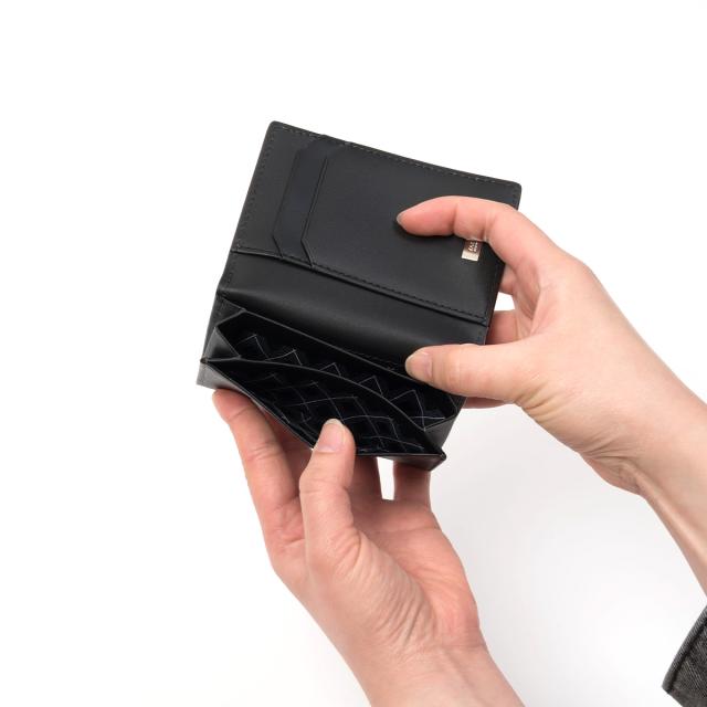 極小のブローチを内装に埋め込んで上品なアクセントになり、価値観を高めています。また、薄く機能的で上品な風琴マチを多用。