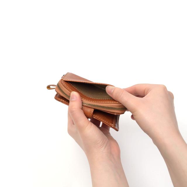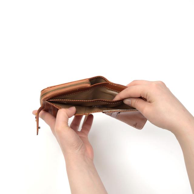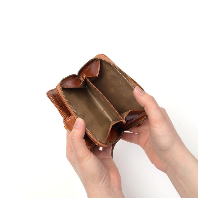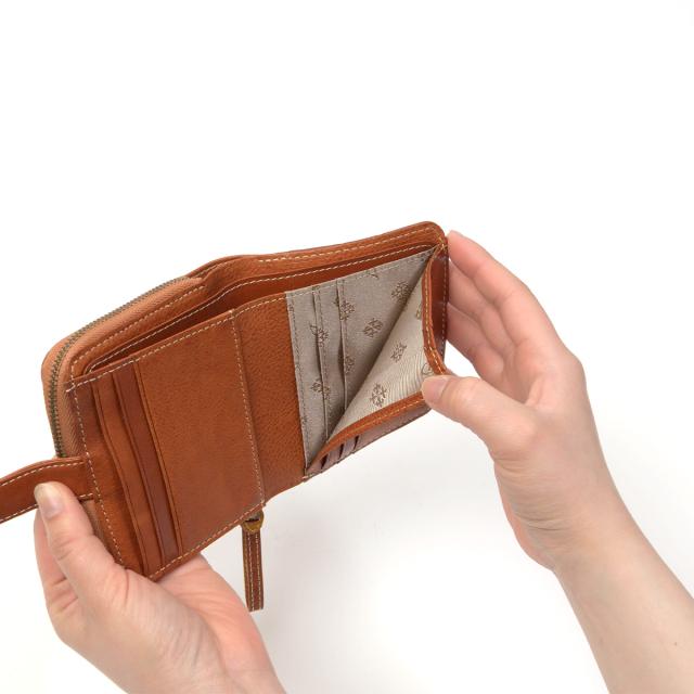 スクエアフォルムの二つ折り財布です。ワンアクションで小銭入れにダイレクトにアクセスできるので、小銭の出し入れがスムーズに行えます。カードは8枚収納でき、コンパクトな見た目ながらも収納しやすいデザインです。