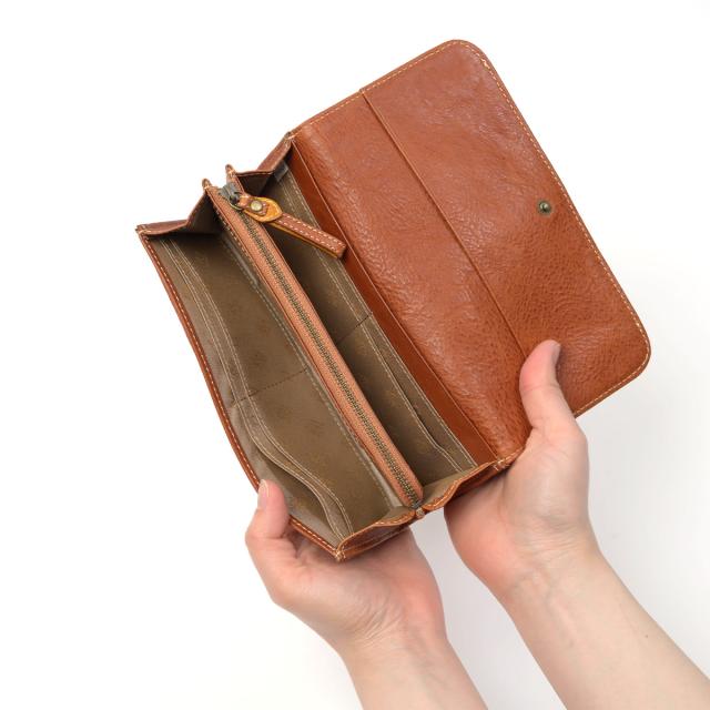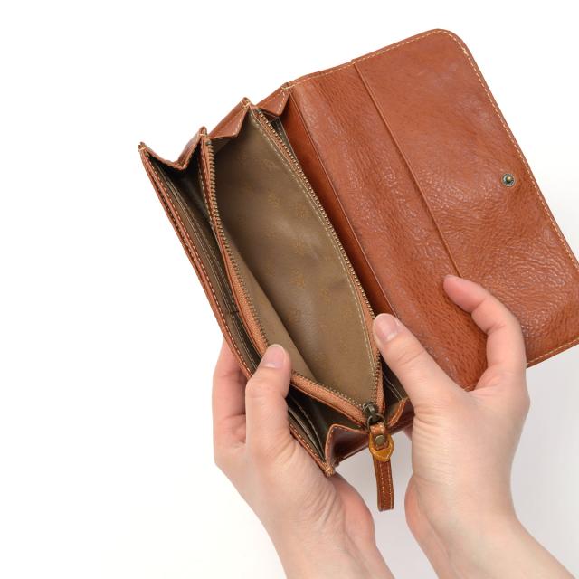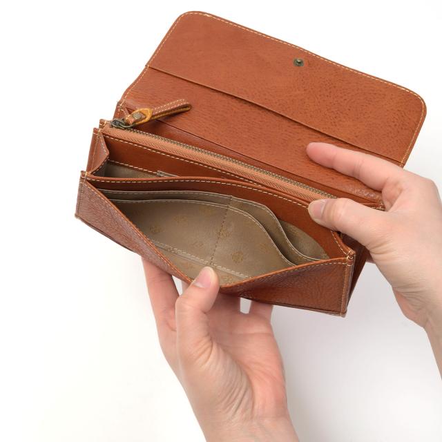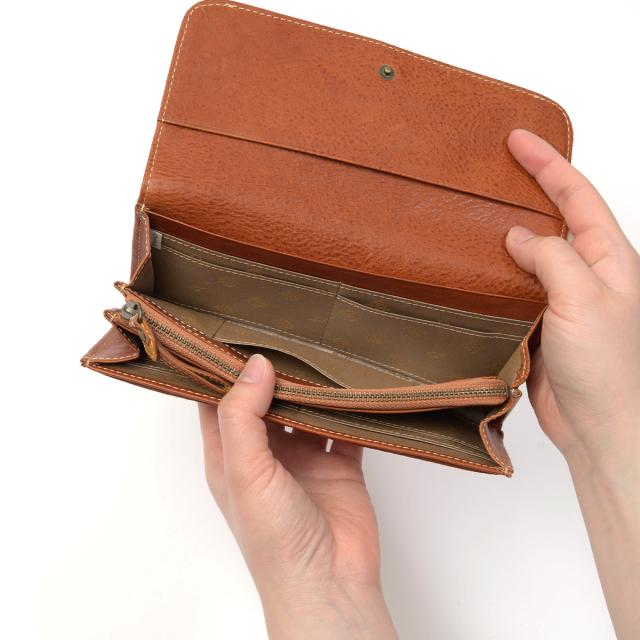 フラップタイプの長財布です。メイン収納は2か所あり、L字ファスナータイプの小銭入れはスリムなデザイン。すっきりとしたフォルムながらカードは16枚収納でき実用的です。