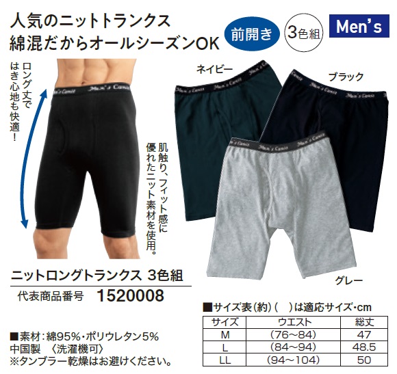 ニットロングトランクス 3色組 トランクス ロング パンツ 綿混 無地 3枚組 メンズ 紳士服 シニア 男性 コットン 綿95% 下着 肌着 前開き ネイビー ブラック グレー 紺色 黒 灰色 シンプル インナー シニアファッション 40代 50代 60代 70代 80代 90代 父の日 お父さん おじいちゃん 春夏秋冬 通年 オールシーズン