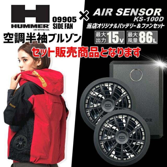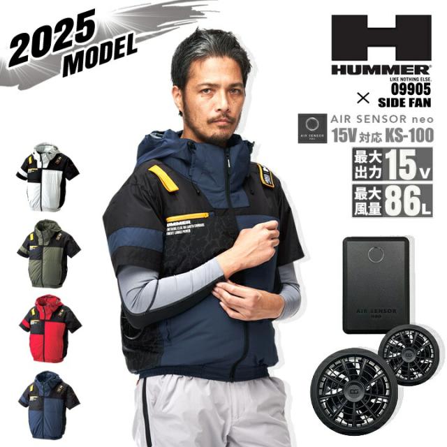 【即日発送】HUMMER ハマー 2025年 空調ウェア サイドファン 半袖ジャンバー 9905 バッテリー&ファンセット クロダルマ KS-100 エアーセンサー 遮熱効果 熱中症対策 撥水加工 男女兼用 フルハーネス フード付き 空調作業服 ファン付きウェア