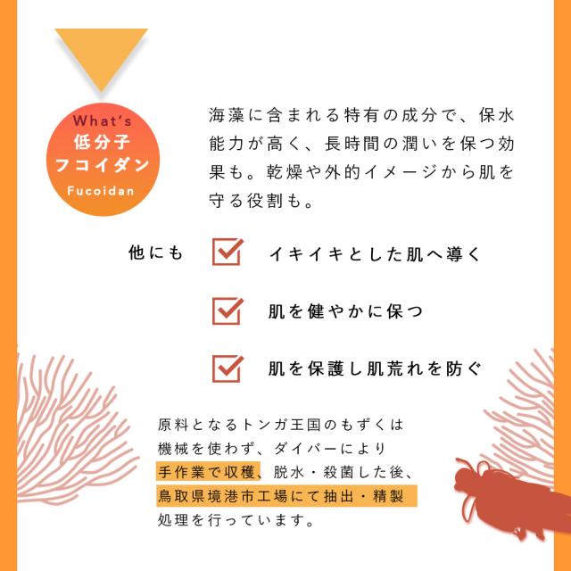 | 商品説明 | ”スキンケアを出来るだけ安く” ”でもキレイを諦めたく無い” そんな声に向き合った限界で奇跡のスキンケアライン【ワタシップス】 天然由来成分100%のMarUmiシリーズの妹ブランドとして、「基材を質の高い自然由来、添加剤を優しいケミカルにこだわり、できる限り安価でお届けしたい」そんな気持ちから誕生した”ワタシップス” 通常の化粧品は70%〜90%メインとなる基材がケミカル由来でコストダウンが図られています。 ワタシップスは 「基材は天然由来」 と、いう大きな特徴に加え、添加物にも気を配り 「なるべく優しいケミカル原料を採用し最小限の配合」に。 更に、MarUmiシリーズでお馴染みのWフコイダンをはじめとした実績のある効果の高い原料を多数配合しています。 ◎ワタシップス共通メイン成分【Wフコイダン処方】 〜低分子フコイダン〜 MarUmiシリーズにも配合されているトンガ王国産天然モズクから抽出された低分子フコイダン。豊富なミネラル、ペプチド、アミノ酸を含みます。生命の源である栄養豊富な海を丸ごとエキス化しています。 〜高分子フコイダン〜 低分子フコイダンと同じくトンガ王国産天然モズクから抽出された高分子フコイダンエキスを配合。高分子フコイダン特有のヌメリ成分が刺激や雑菌からお肌を保護し、乾燥やアレルギー物質による刺激要因からお肌を守ります。また抗酸化作用に優れ、紫外線による弾力成分の劣化を防ぎ、ふっくらとしたお肌を持続させます。 |