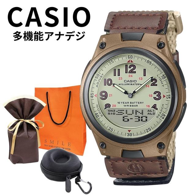 ラッピング済 ギフトセット 正規品 カシオ 腕時計 メンズ 父の日 収納ケース付き アナデジ 10年電池 防水 ワールドタイム アラーム付 おしゃれ カジュアル ミリタリー調 ナイロンベルト カーキ 男性 ギフトにも人気 プレゼント 成人 卒業 入学