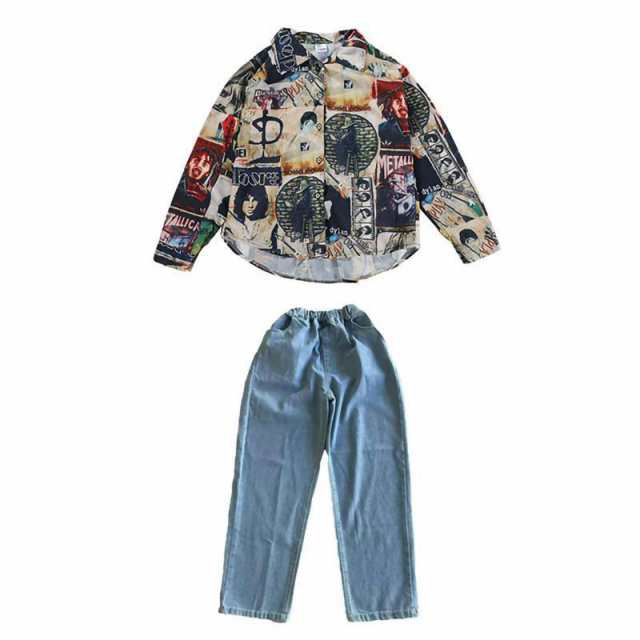 キッズ ストリートダンス 衣装 ヒップホップ用 長袖ブラウス ゆったりデニムパンツ 男の子女の子兼用 ダボダボ 練習着 上下セット ダンスウェア