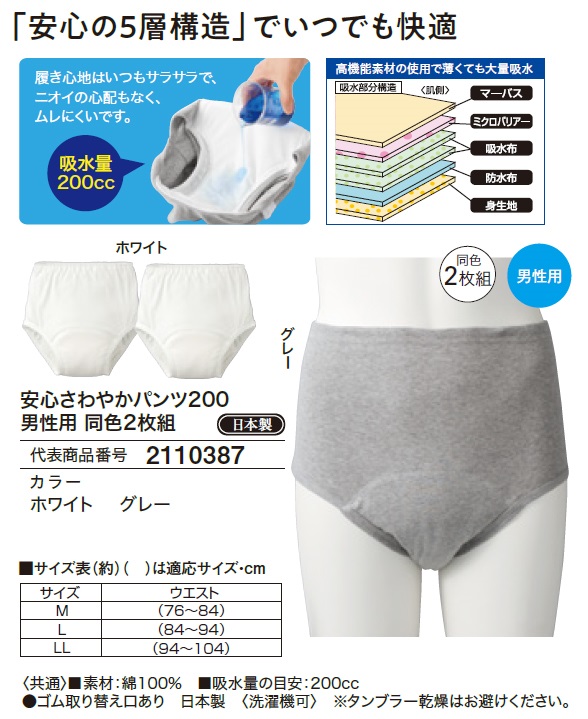 尿漏れパンツ 吸水パンツ メンズ 尿漏れ 尿失禁 対策 日本製 紳士 安心さわやかパンツ200 男性用 2枚組 吸水ショーツ ホワイト グレー 白 紳士服 シニア 男性 綿100% インナー 肌着 介護用品 下着 ぱんつ 介護 入院 吸収 軽失禁 40代 50代 60代 70代 80代 90代 父の日 お父さん おじいちゃん