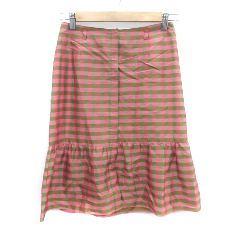 【中古】ロペ ROPE フレアスカート ボタンダウンスカート ミモレ丈 チェック柄 60-86 S ピンク カーキ