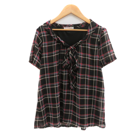 【中古】エルプラネット ブラウス カットソー 半袖 ボウタイ シフォン チェック柄 40 L 黒 ブラック レディース