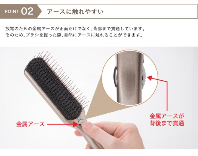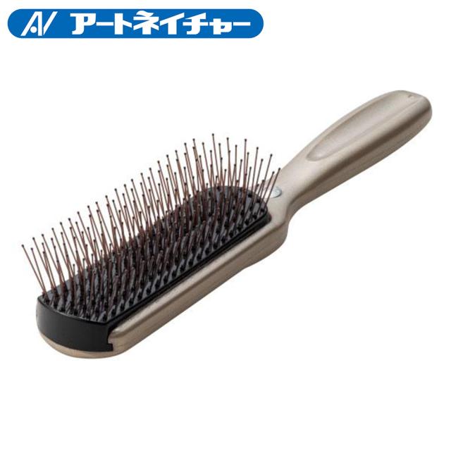 アートネイチャーの除電ブラシは、ブラシ部両サイドのステンレス鋼除電繊維と金属アースがブラッシング時に発生する静電気を取り除きながら、髪をときほぐします。細く弾力性のある先の丸い毛を1本1本植えてあり、柔らかく地肌をマッサージするように髪の毛をとかすことが出来ます。髪がやわらかく、髪の毛が絡まりやすい方におすすめです。