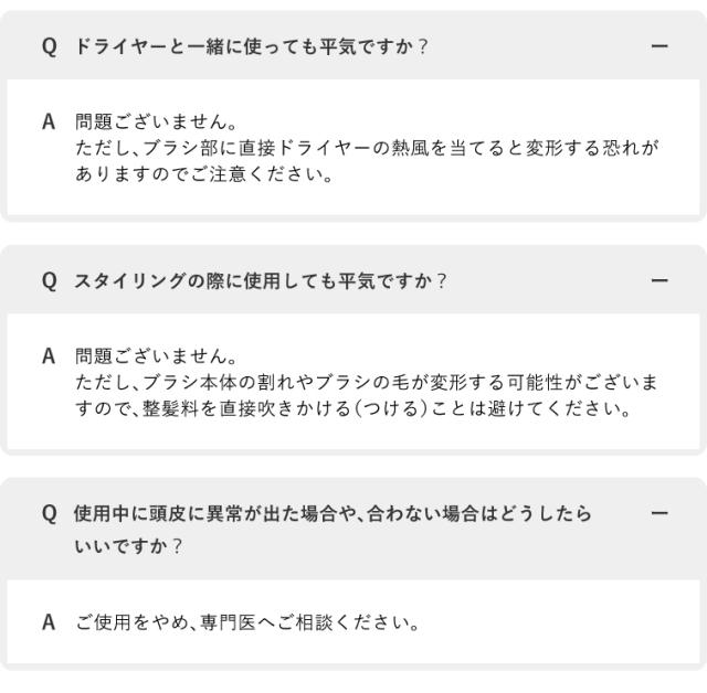 ●ブラシ部に直接、ドライヤーの高熱風を長時間当てたり、整髪料がつくとブラシ本体の割れやブラシの毛が変形する恐れがありますので避けてください。