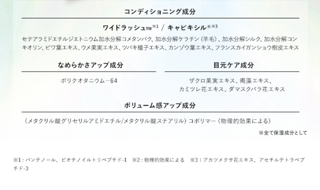 水、BG、グリセリン、プルラン、パンテノール、ビオチノイルトリペプチド−1、アセチルテトラペプチド−3、アカツメクサ花エキス、ポリクオタニウム−64、(メタクリル酸グリセリルアミドエチル/メタクリル酸ステアリル)コポリマー、セテアラミドエチルジエトニウム加水分解コメタンパク、加水分解ケラチン(羊毛)、加水分解シルク、加水分解コンキオリン、ビワ葉エキス、ウメ果実エキス、ツバキ種子エキス、カンゾウ葉エキス、ザクロ果実エキス、褐藻エキス、カミツレ花エキス、ダマスクバラ花エキス、フランスカイガンショウ樹皮エキス、エチルヘキシルグリセリン、ペンチレングリコール、(アクリレーツ/アクリル酸アルキル(C10−30))クロスポリマー、デキストラン、キサンタンガム、クエン酸、水酸化K、フェノキシエタノール