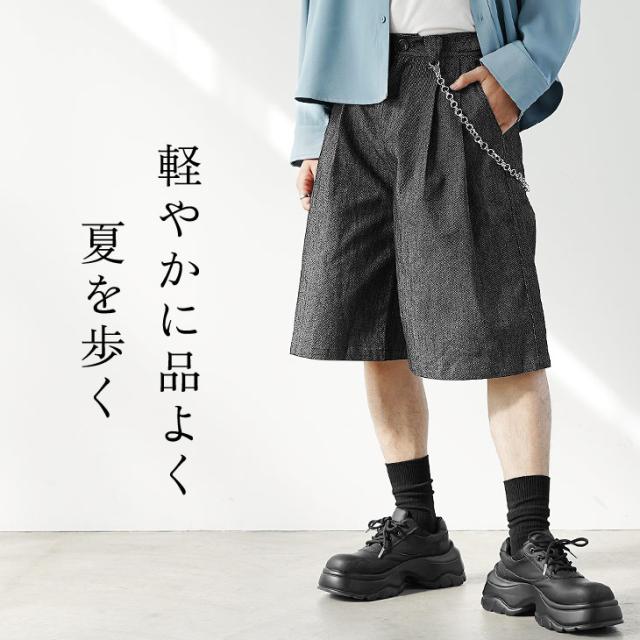 フロントに施された深いタックが立体的なシルエットを創り出し、品の良い大人のヌケ感を演出するハーフパンツ。杢調のツイル素材と膝下の丈感で子供っぽくならず大人な雰囲気に。夏らしい軽やかなカジュアルコーデにぴったりのアイテムです。