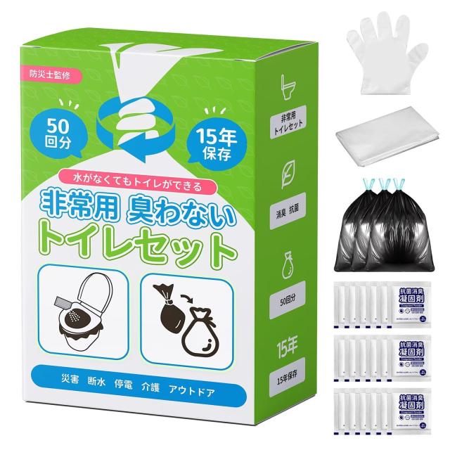 【充実なセット内容&】◆ひも付きの汚物袋 X50枚 ◆凝固剤 X50個、◆防臭袋 X5枚 ◆ビニー ル手袋 X50枚 ◆説明書 X1枚 ?より簡易トイレセットを検品しておりますが、、当社の製品に不良などが発生した場合、またはその他の事由で交換されたい場合には、注文番号を記?の上、購入サイト内お買上けの販売店にを下さいませ。か新品交換をさせていただきます。