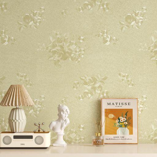 ?【和モダンな空間に】ブライトゴールドの織物調に花柄のシルエットが広がる和風壁紙。花柄のシルエットは独特な凹凸感があり、触るとザラザラ、近くで見るとほんの少し光沢感があります。和風壁紙とはいえ、落ち着いた色合いと柄なので、部屋全面に張っても賑やかすぎません。和室だけではなく、洋室にも使えます