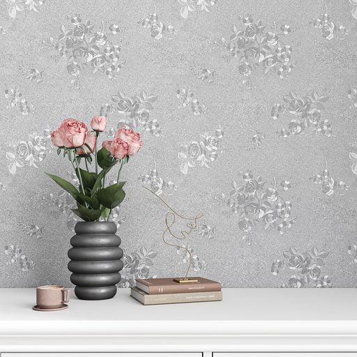 和モダンな空間に:銀灰色の織物調に花柄のシルエットが広がる和風壁紙。花柄のシルエットは独特な凹凸感があり、触るとザラザラ、近くで見るとほんの少し光沢感があります。和風壁紙とはいえ、落ち着いた色合いと柄なので、部屋全面に張っても賑やかすぎません。和室だけではなく、洋室にも使えます