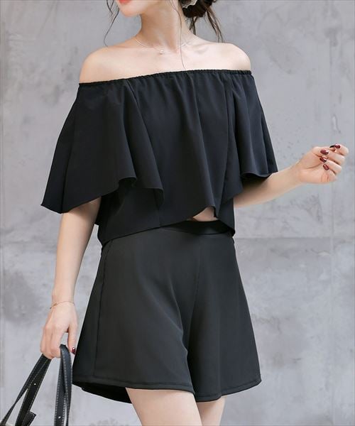 レディース水着 2WAYクロップドオフショル風トップス+ショートパンツ 2点セット