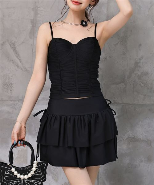 レディース水着 大人のバレエコア。ギャザービスチェ風リボンビキニ+ダブルフリルスカート 3点セット