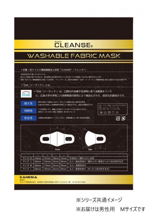 | 肌触りの良い2WAY素材。耳が痛くなりづらい幅広設計。効果の耐久性・持続性・安全性・手洗洗濯50回。裏面は抗菌・抗ウイルス機能繊維加工技術CLEANSEを採用しています。 抗菌・抗ウイルス機能繊維加工技術「CLEANSE/クレンゼ」は、固定化抗菌成分「Etak(イータック)」を繊維表面に強力に固定化する加工技術です。「Etak(イータック)」は、口腔内の治療や洗浄時に使う消毒薬をベースに、広島大学大学院二川浩樹教授の研究により商品化された、固定化抗菌成分です。耐久性:素材の風合いを維持しながら、抗ウイルス機能の高い持続性を表現。●広島大学大学院二川浩樹教授の研究により商品化された、固定化抗菌成分です。持続性:50回洗濯しても、繊維状の特定ウイルスを99%以上減少させます。試験方法:ISO18184に準拠/試験素材:綿100%ブロード。安全性:口腔衛生用抗菌剤をベースにしており、各種試験により高い安全性を確認。 |