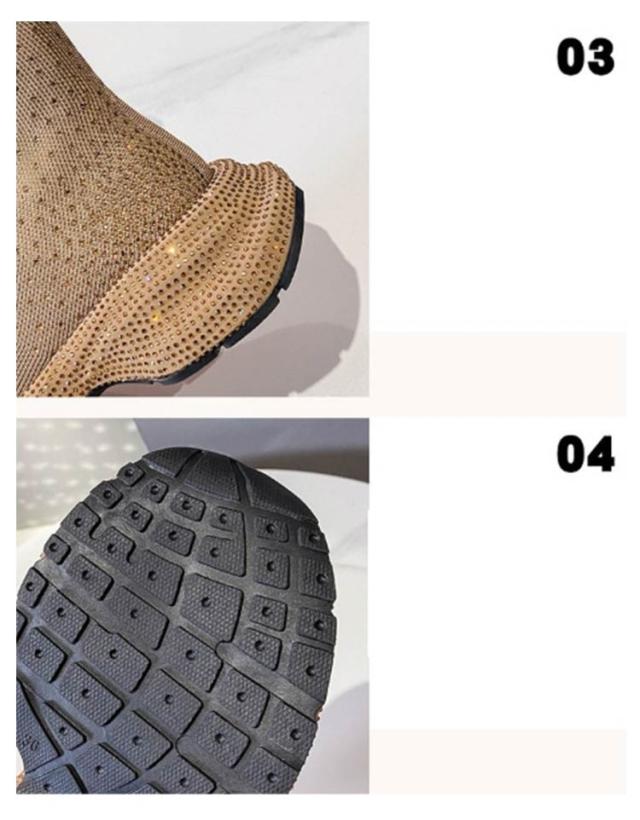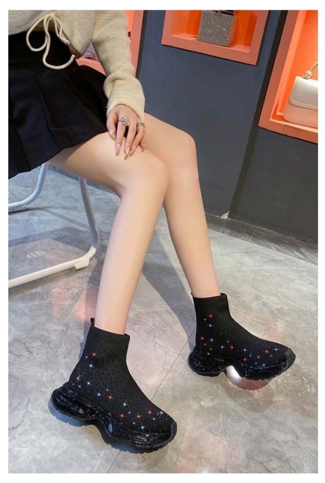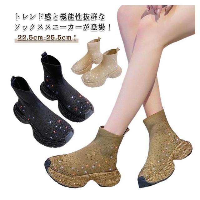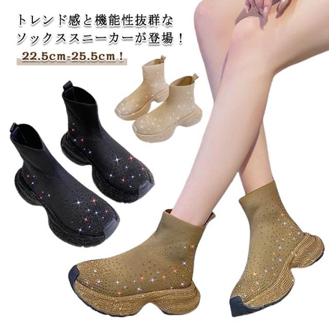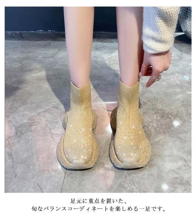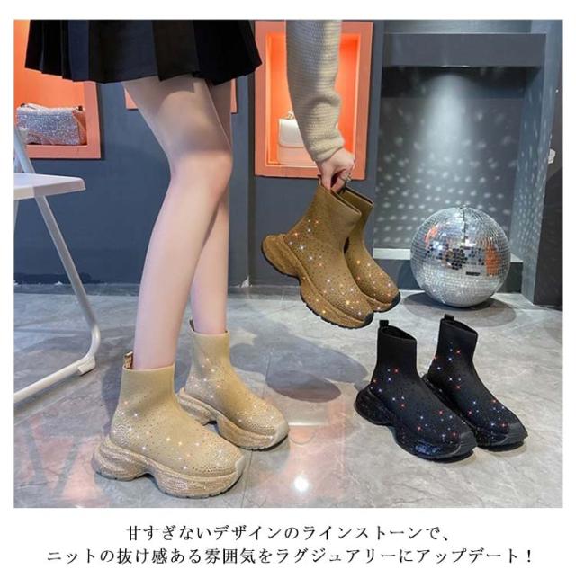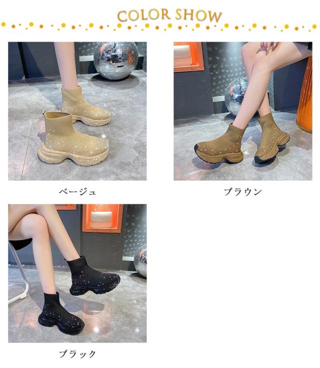 キラキラ ラインストーン ニットソックススニーカー ショートブーツ レディース ブーツ 靴 厚底 プラットフォーム 軽量 スニーカーソール ハイカット ショート丈 スポーティ ストレッチ 歩きやすい 痛くない ベージュ ブラウン ブラック