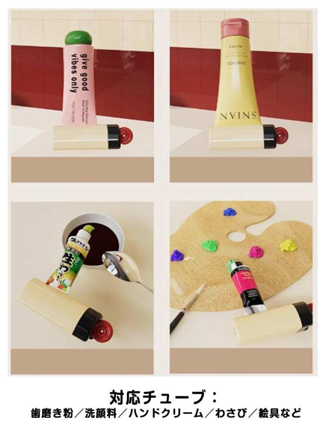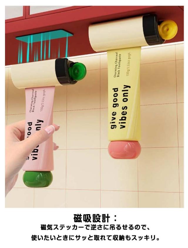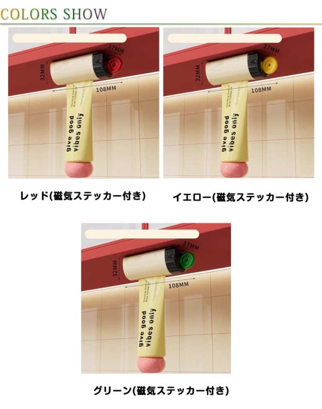 | 最後まで使い切ることが可能!チューブ絞り器 磁気ステッカー付き、どこでも好きな場所に取り付けできます。 省スペースで設置でき、簡単に押し出せる便利アイテムです。 おしゃれなカラーで洗面所に彩りを添えます。 磁吸設計:磁気ステッカーで逆さに吊るせるので、使いたいときにサッと取れて収納もスッキリ。 押し出し:ノブを軽くひねるだけで、適量のチューブを押し出せます。 汎用スロット設計:歯磨き粉のサイズを問わずしっかり装着。 簡単分解&清潔:本体は簡単に取り外せて、お手入れもラクラク。 対応チューブ:歯磨き粉/洗顔料/ハンドクリーム/わさび/絵具など | |