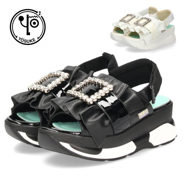 ヨースケ 厚底サンダル レディース ブラック ホワイト 黒 白 ビジュー フリル バックストラップ YOSUKE 4450033
