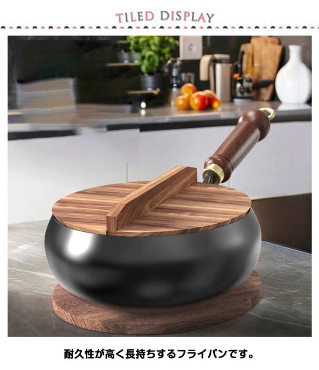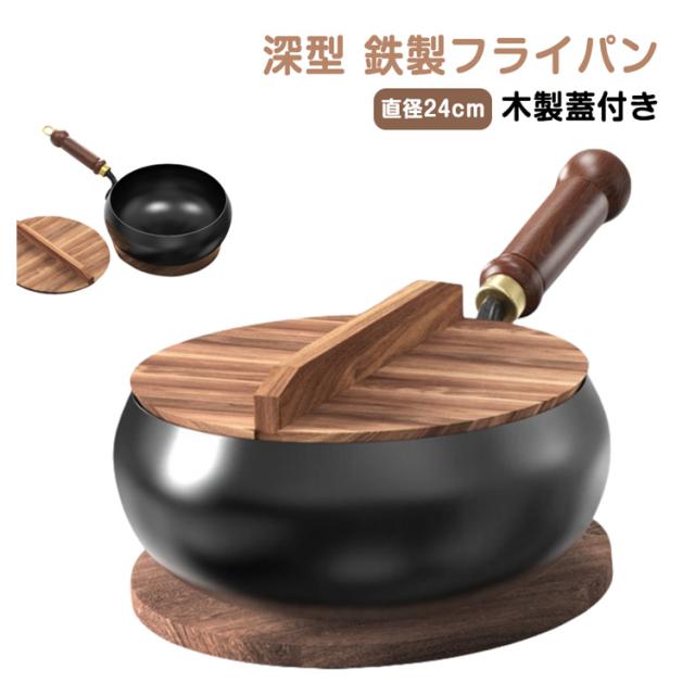 | 【深型】【鉄製フライパン】【【木製蓋付き】 耐久性が高く長持ちするフライパンです。 深型で少ない油で揚げ物も! 握りやすく、熱くなりにくい、天然木製の取っ手も装備。 木製の蓋も備えていますので、360度密閉することで美味しさを保持します。 鉄製なので熱の伝わりが良く、高温調理が可能です。 ご注意:鍋底が平らでないため、IH調理器での使用は推奨いたしません | |