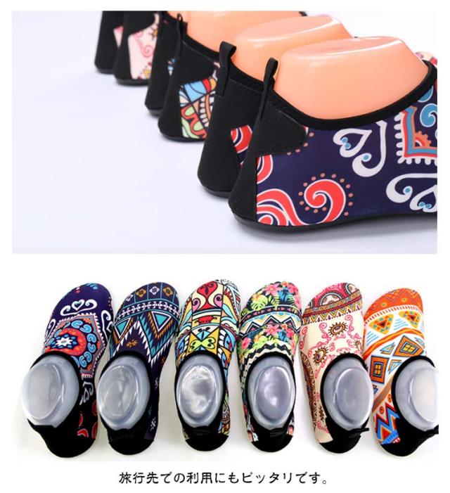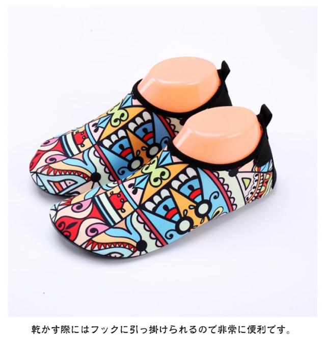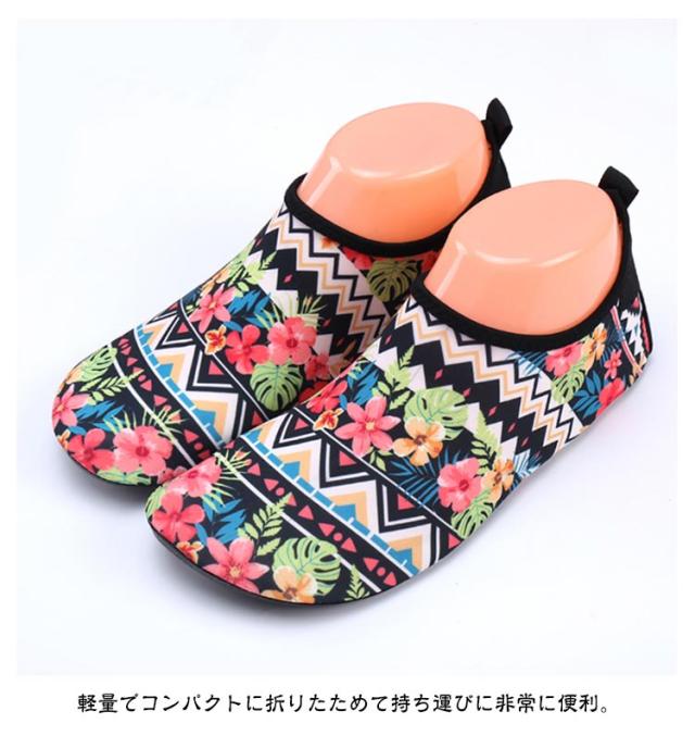 | 水陸両用で使用できるウォーターシューズ。 水中でのケガ防止に!サンダルだと波や川の流れで脱げやすく、水中には鋭利な貝殻やガラス片などのキケンがいっぱい。ウォーターシューズなら足にフィットして動きやすく、水中でよりアクティブに、より安全で快適な時間を過ごすために、多くの人々にとって必需品となっています! グリップの効くラバーソウル!グリップ力が強く耐久性のあるラバーソールを使用。足元を守り、水面や滑りやすい岩などでの転倒防止につながります。また真夏の砂浜はやけどする程熱く履くだけで安心して砂浜を歩く事が出来ます。 通気性の高い素材で素早く乾燥し、かかとにはプルストラップもついているので着脱しやすい。 乾かす際にはフックに引っ掛けられるので非常に便利です。 スニーカー感覚で履けて着脱しやすくしかも軽量なので非常に快適。 軽量でコンパクトに折りたためて持ち運びに非常に便利。 非常に軽量な為長時間使用しても疲れにくく快適に過ごすことができます。 旅行先での利用にもピッタリです。 | |